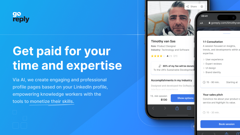 GoReply offers professionals to monetize their time & expertise through short consultancy sessions. Quickly set up your profile using our AI tool, share your URL on social media, and start earning. Optionally, donate part of your earnings to charity.