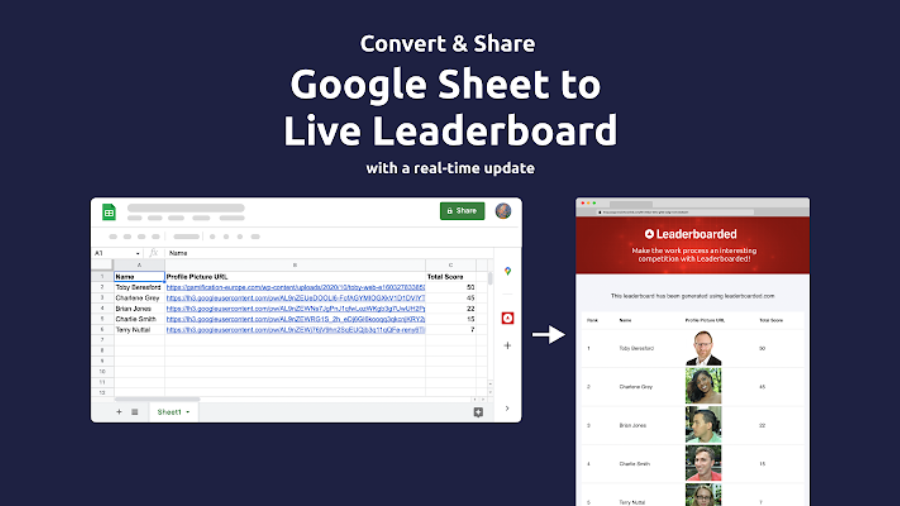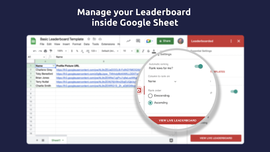 - Follow the URL link on your spreadsheet to view and share your generated leaderboard on leaderboarded.com.