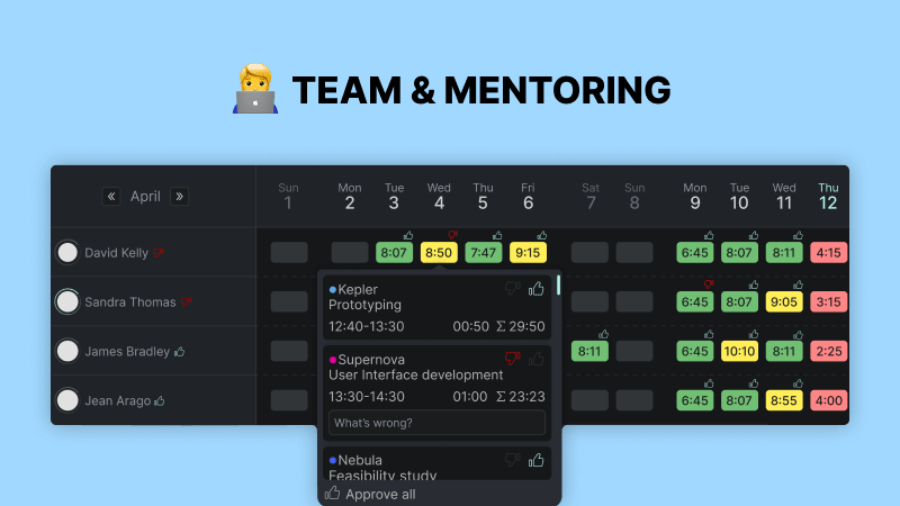 Some of the key features of Worklog include fast time logging with autocomplete and prediction capabilities, the ability to share your status with your team, mentoring and approval features, and convenient reporting options like PDF and Excel exports. We've also included a dark theme, daily progress indicators, and overtime alerts to help you stay on top of your work.
